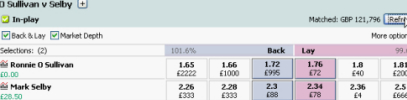 The screenshot above shows that we placed a £100 bet on Mark Selby before the event started. The match was quite close and the odds stayed the roughly the same for around half an hour.